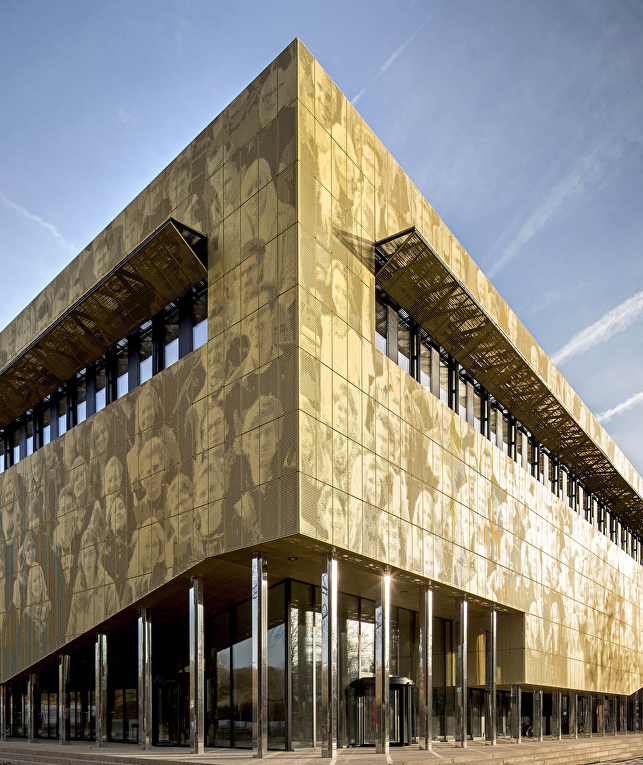 Jean Nouvel's Philharmonie, chosen after a competition, is a rock-like structure resembling a hill in Parc de la Villette, featuring innovative aluminum forms around the central concert hall and a bird mosaic on its angled matt envelope. The 37-meter high accessible roof offers panoramic views merging city and suburbs.