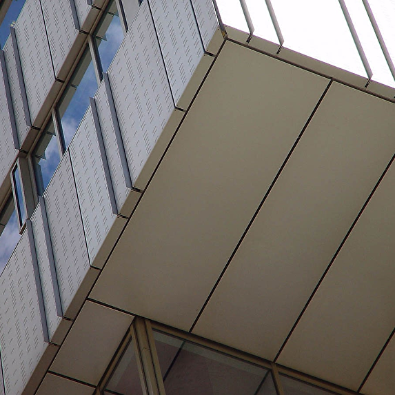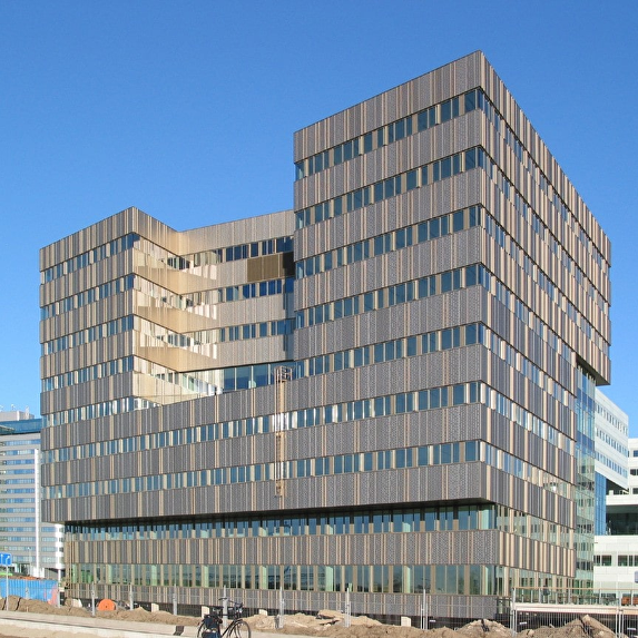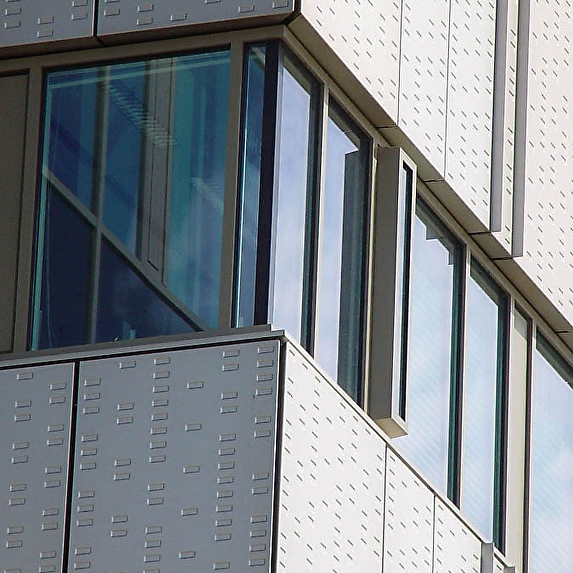 This office building is part of Plaza Arena, an office building complex in Amsterdam South-East. It is located near the Amsterdam Arena, Amsterdam’s main football stadium, whose surroundings have become a lively neighbourhood for business and commerce. Each of the buildings in Plaza Arena has got a name that references to a historical figure, like ‘Minerva’ and ‘Dali’; this building is called ‘Gaudi’. The 5500 square metre façade has been realised in anodised aluminium. To accentuate the vertical joints, slightly protruding shade bars have been placed vertically on the façade