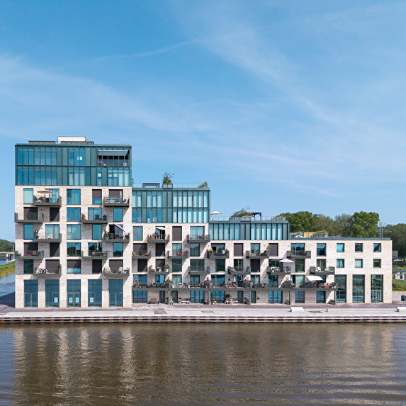 The facade pairs robust brickwork with finely detailed metal elements, including anodized aluminium in AluGreen mat etched. This deep, earthy green finish was selected to echo the natural tones of the surrounding water and landscape, offering a subtle contrast to the masonry while adding texture and variation under changing light.