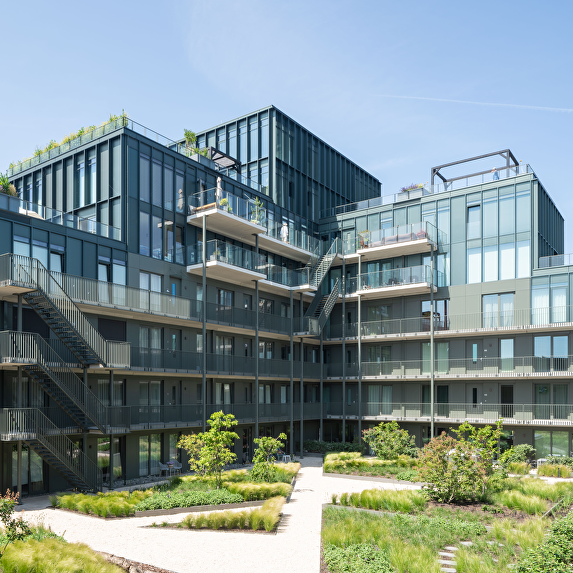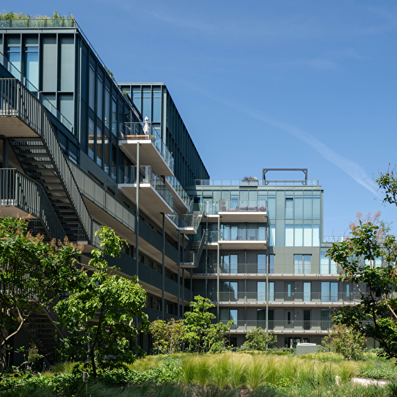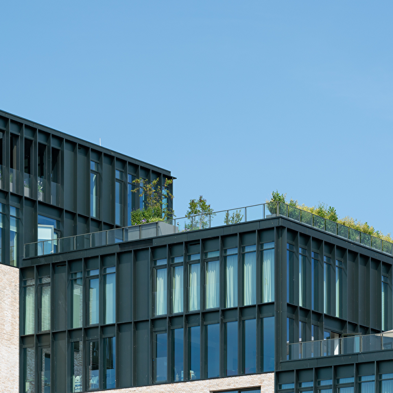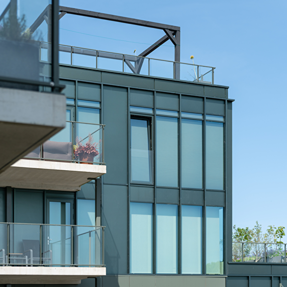 The stepped massing opens up to the canal, allowing for rooftop gardens and generous outdoor spaces. From street level to the upper terraces, the anodized elements bring cohesion and refinement, framing windows and balconies with precision.