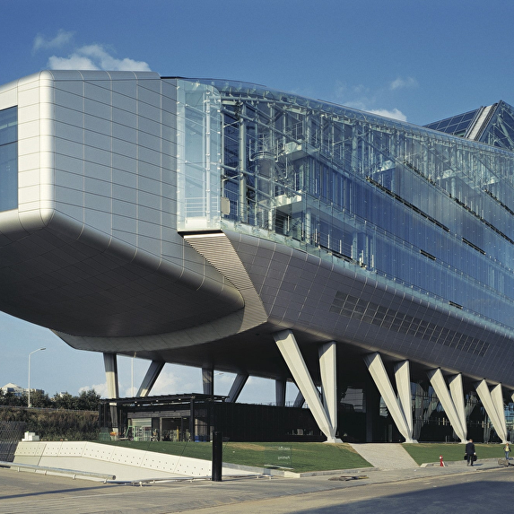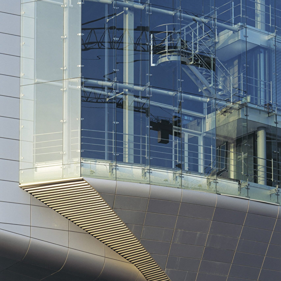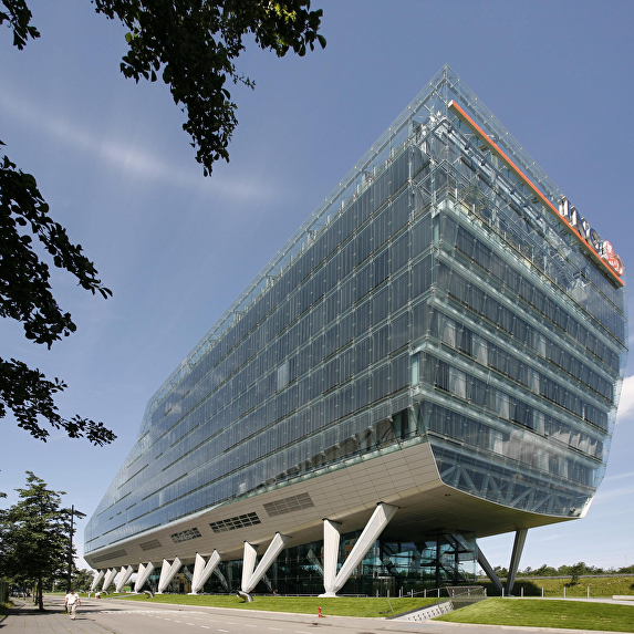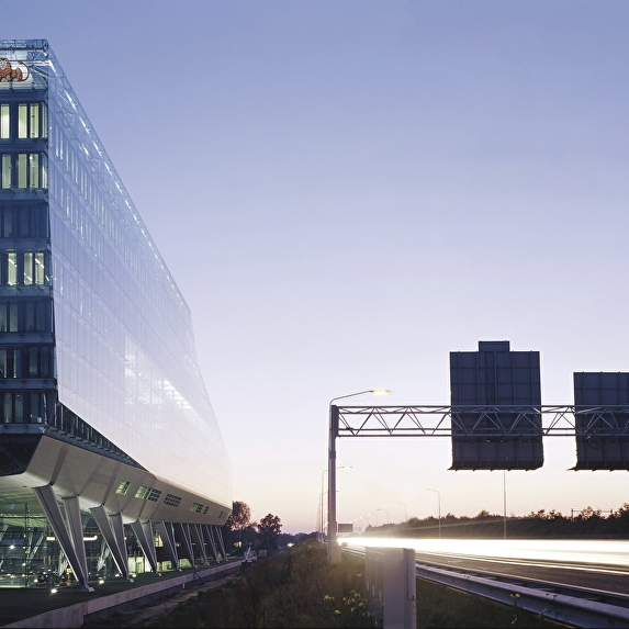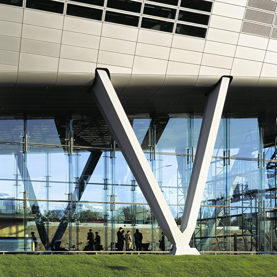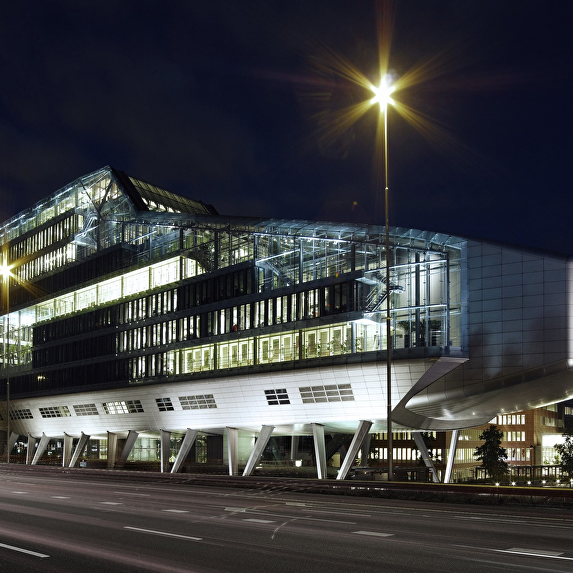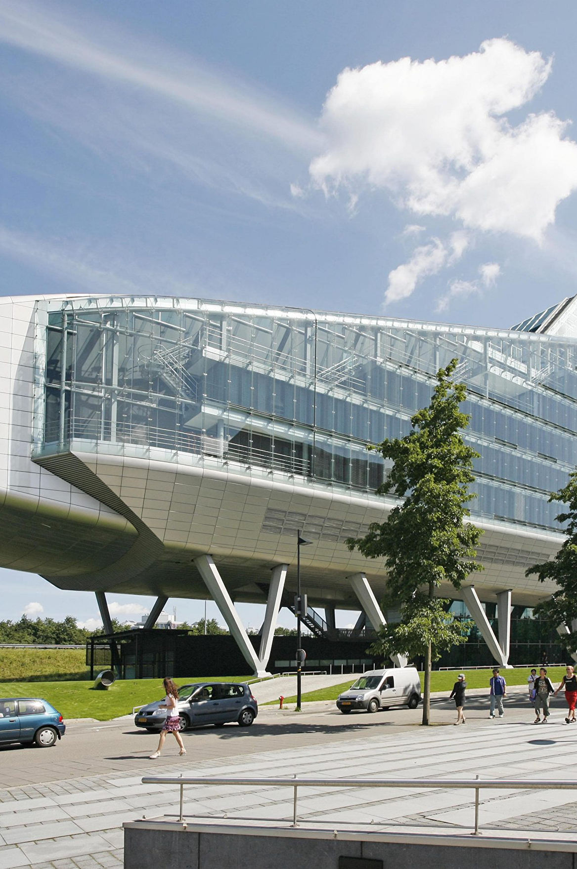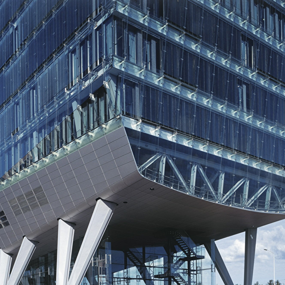 The headquarter offices for the ING Group occupies a long, narrow site adjacent to the motorway ring around Amsterdam. The location is at the junction of two areas, the cosmopolitan high-rise of Zuidas and the green zone of De Nieuwe Meer. The building has been kept low on the green side, with the cantilevered auditorium as a projecting element, and rises towards the urban side. The building rests on stilts measuring 9 to 12,5 metres in height, so that travellers on the motorway still have a glimpse of the area behind the building. This arrangement also means that none of the offices in the building have their view blocked by the motorway embankment. The entrance zone is ensconced between the stilts. The atmosphere of the interior is richly varied and features an alternation of open and sheltered spaces. Successive storeys intermingle and offer recurrent glimpses from one to another. Areas with a panoramic view, such as the restaurant, the large conference room and the auditorium, exist alongside introverted spaces. Atriums, loggias, and gardens, both internal and external, are distributed through the building at various levels.
