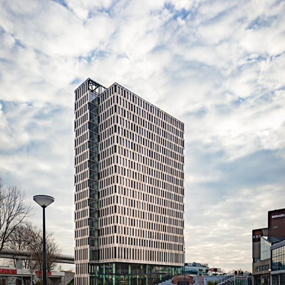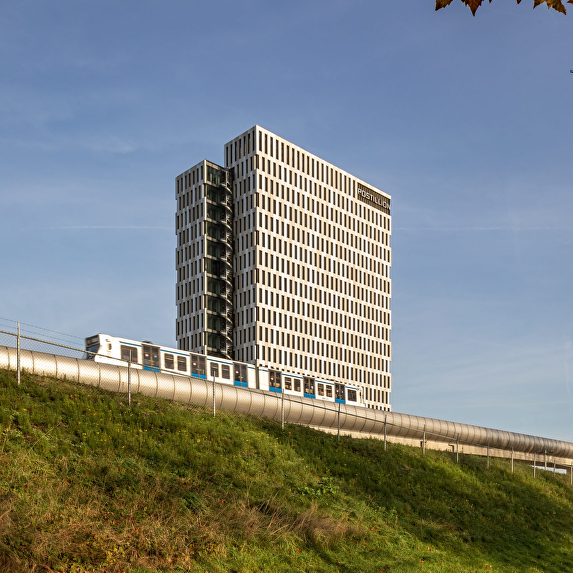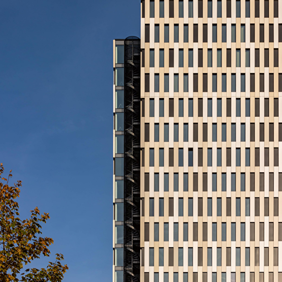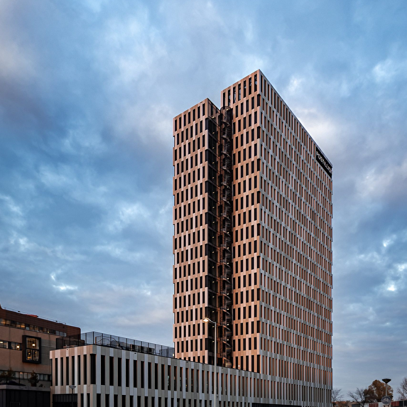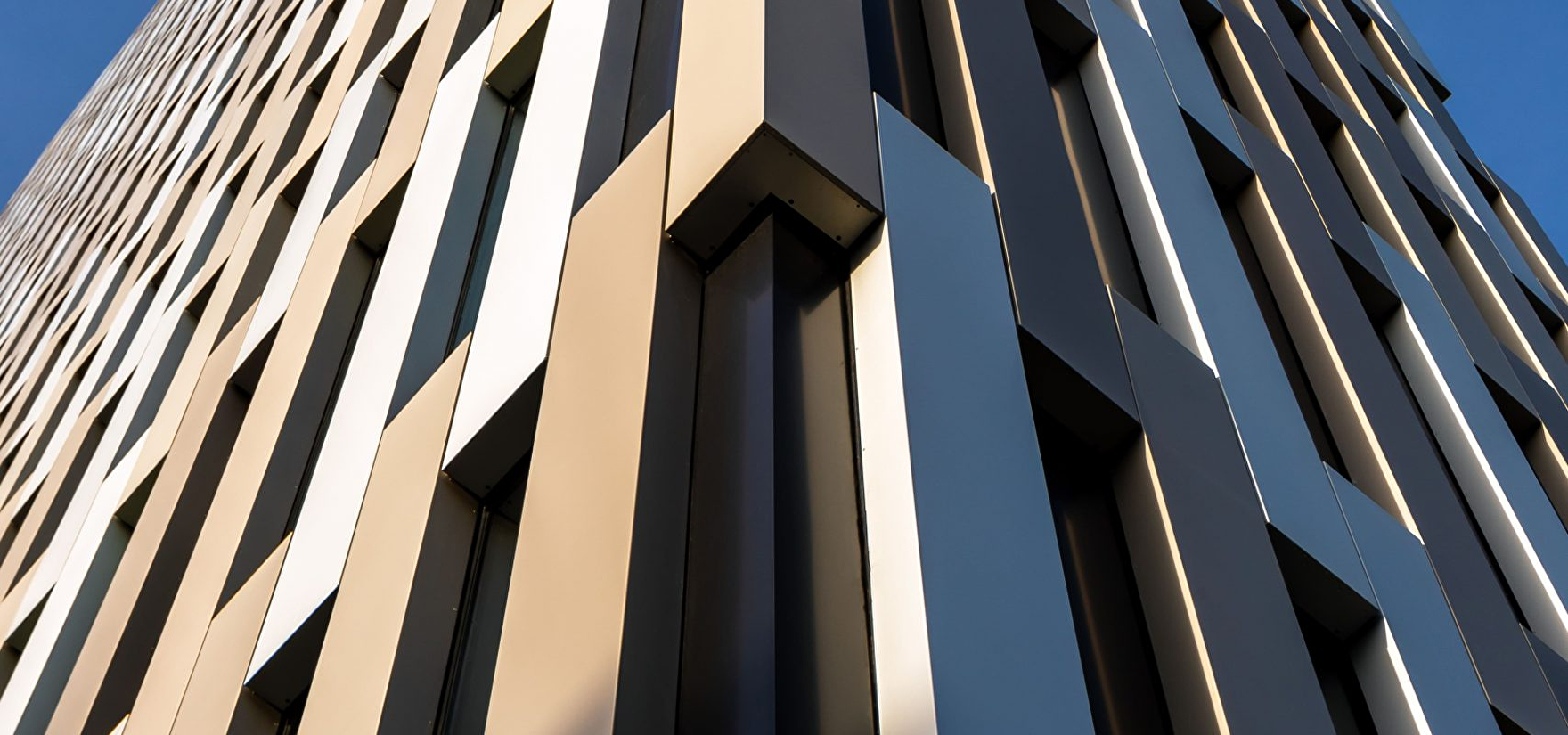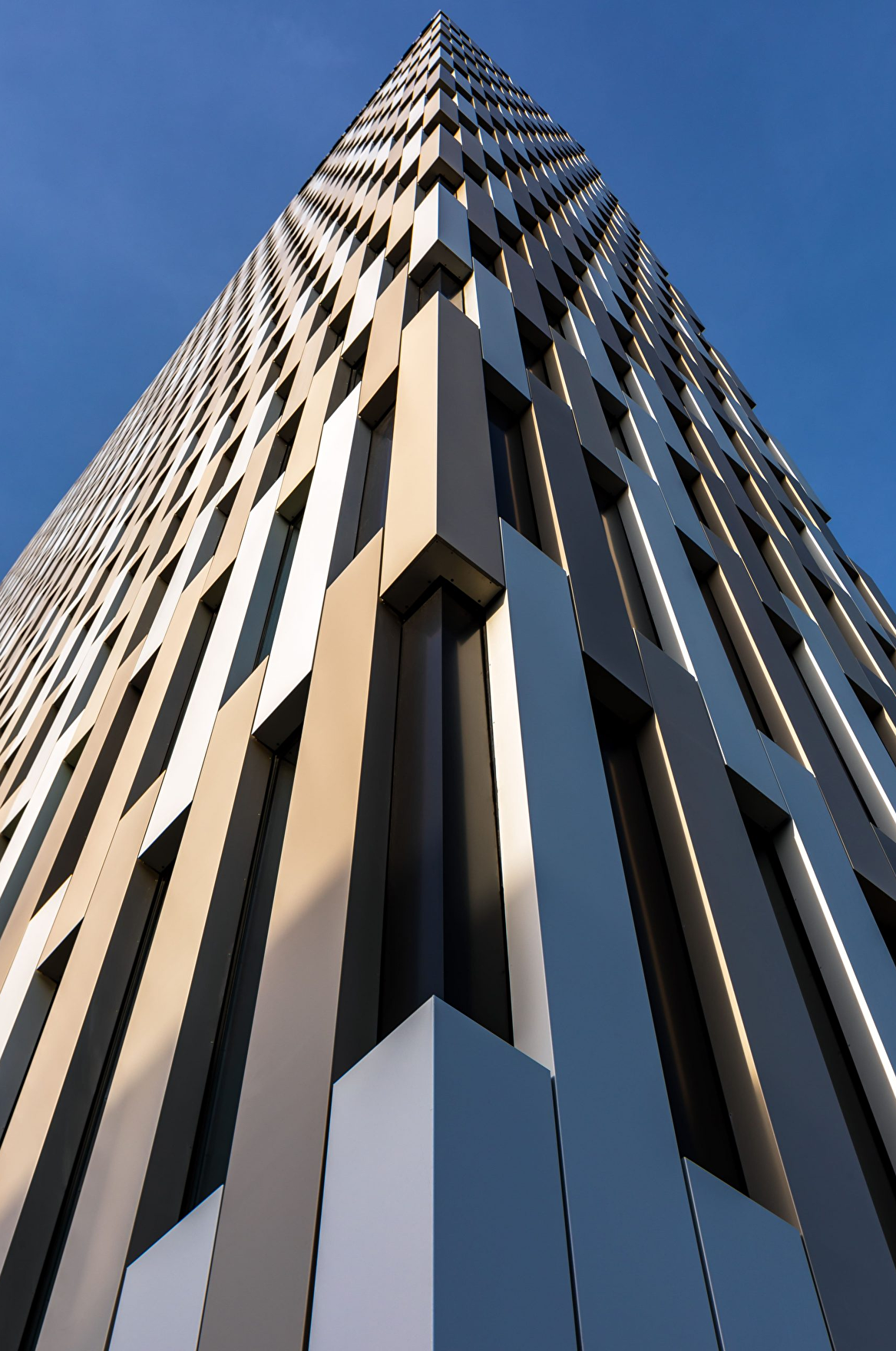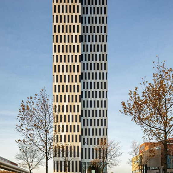 Kauwgomballenfabriek is a 65-metre tall hotel with a special facade cladding, which resembles the links on a watch strap. In Amsterdam, everyone has heard of the Kauwgomballenfabriek (in English: chewing gum factory). It is a former industrial complex with work spaces for creative entrepreneurs. In 2018, Postillion Hotels opened a hotel on the premises. The hotel was designed by Architectenbureau Concrete. Because the hotel tower consists of two narrow volumes, the result is an elegant and slim building with an abstract facade made of anodised aluminium cassettes.