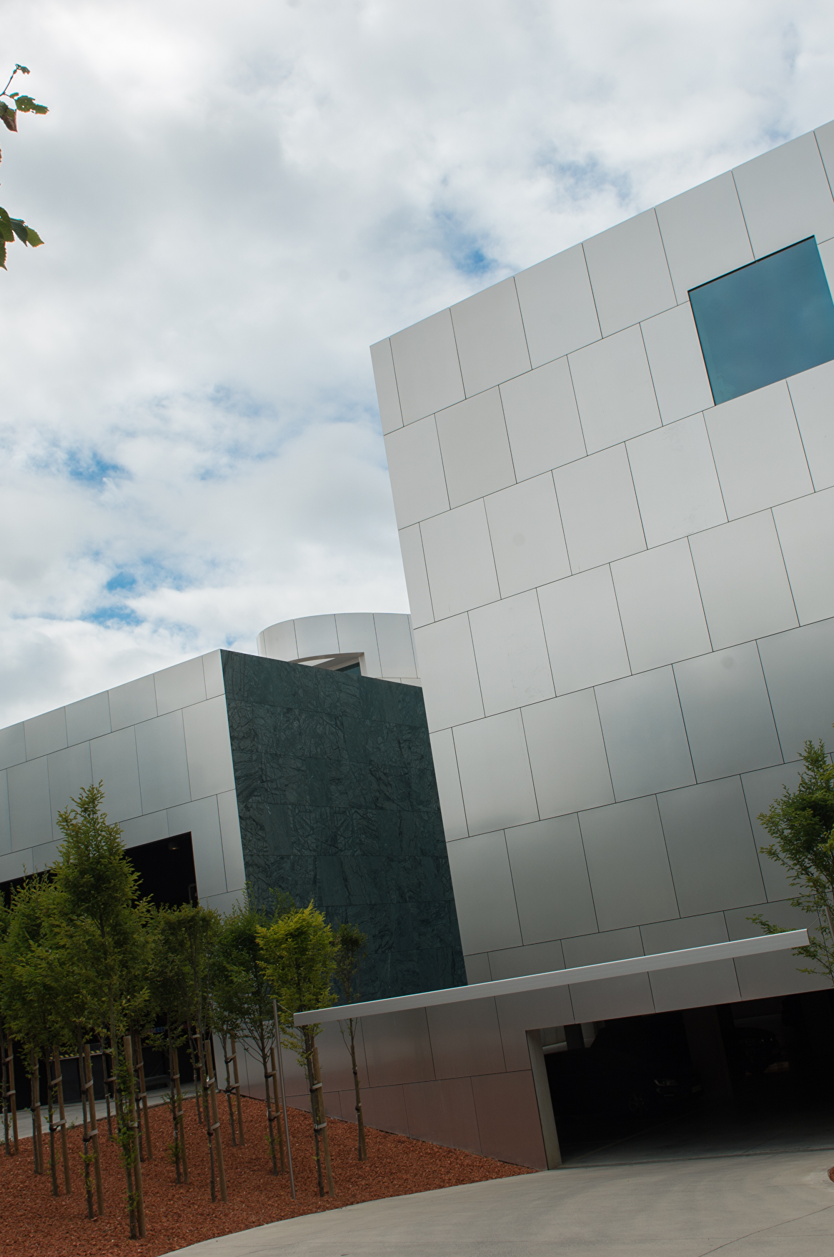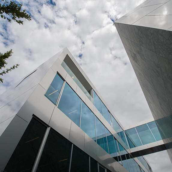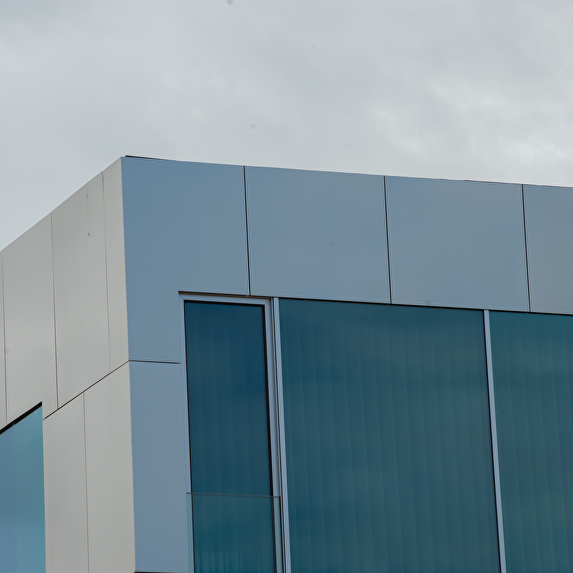 The façade is executed in anodized aluminium in AluNature, the pure colour of aluminium. In combination with a polished surface quality, the material gains a refined, reflective character that subtly responds to light and its surroundings.