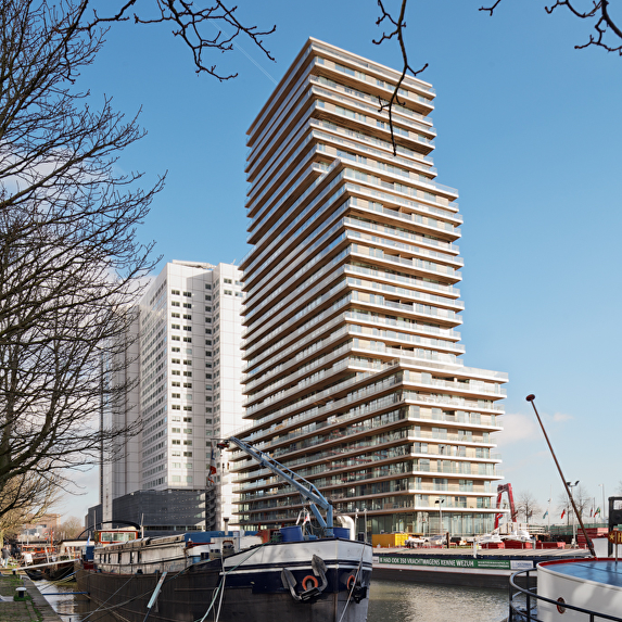 This 110-meter high residential tower in Rotterdam, located directly on the banks of the Maas, has a unique shape. This design helps the residents of the apartment complex behind it retain as much of their view as possible. The residential tower now stands on the site where an office building, designed by Herman D. Bakker in 1965, once stood. The original idea was to integrate the office building into the new structure, but this ultimately proved to be impossible. However, as a tribute, the shape of the office building has been retained for the lower floors.